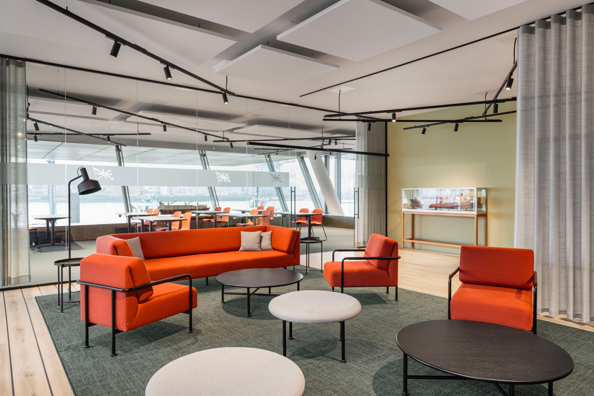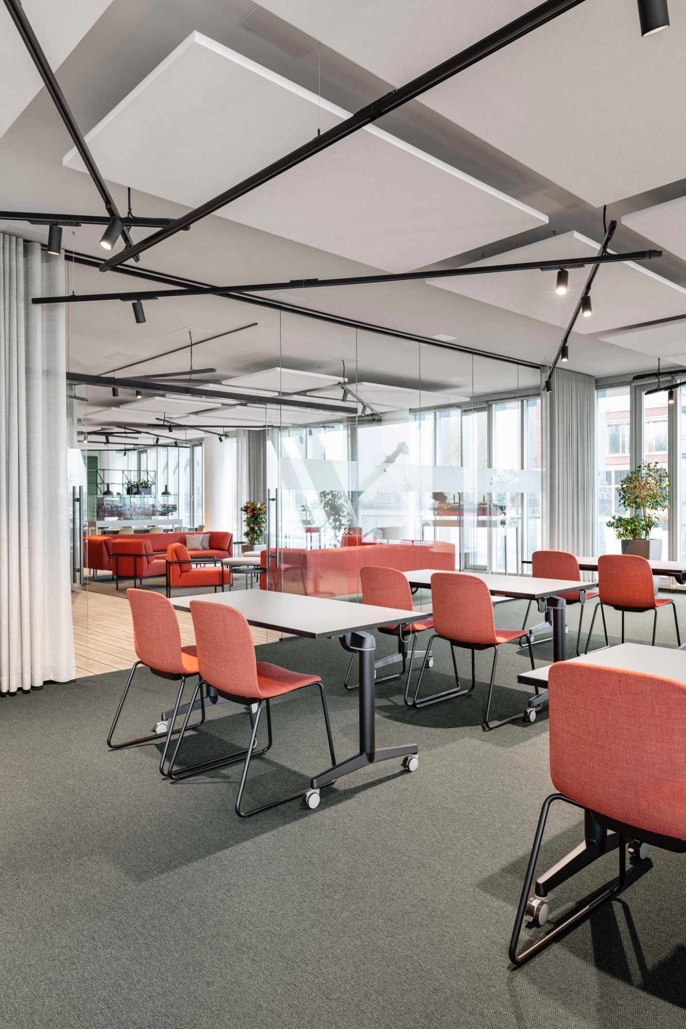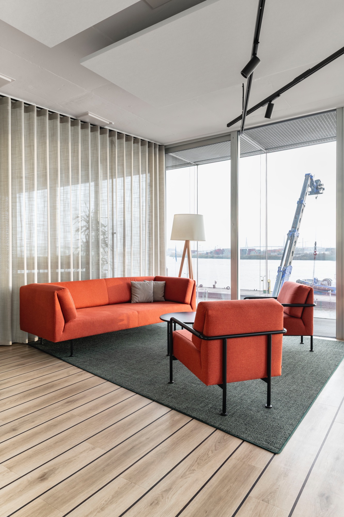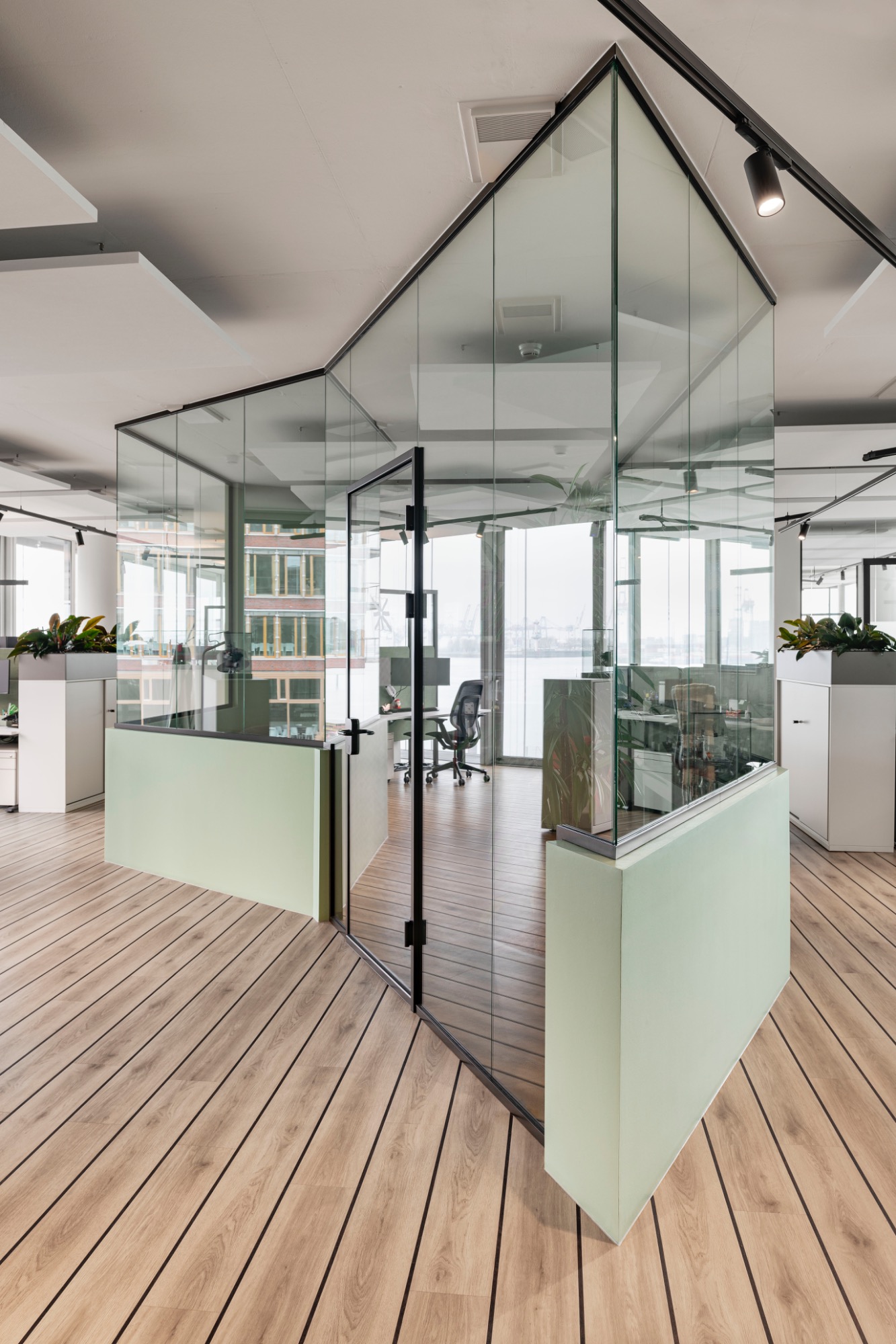 Zentrale Leitidee des Entwurfs ist das Motto „Kehr wieder!“. Dieser historische Hamburger Ausruf symbolisiert die Rückkehr an einen vertrauten Ort, an dem Begegnung, Austausch und gemeinsames Arbeiten selbstverständlich sind. Dafür wurden zonierte Arbeitswelten geschaffen: offene Arbeitsinseln, flexible Breakout-Räume, individuelle Rückzugsbereiche sowie multifunktionale Gemeinschaftsflächen wie die „Know-How-Börse“ und das „gemeinsame Wohnzimmer“. So entsteht eine Bürostruktur, die sowohl fokussiertes Arbeiten als auch spontane Interaktion ermöglicht – und den Erfahrungsschatz der Mitarbeiter aktiv nutzbar macht.